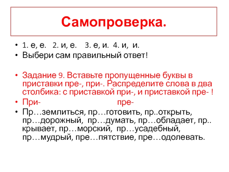 Задание 9. Вставьте пропущенные буквы в приставки пре-, при-. Распределите слова в два столбика: с приставкой при-, и приставкой пре- !