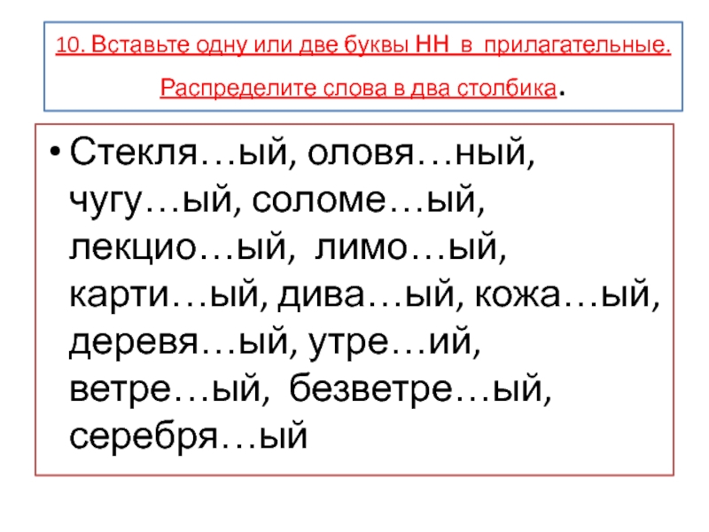 Слайд 1510. Вставьте одну или две буквы НН в прилагательные. Распределите слова