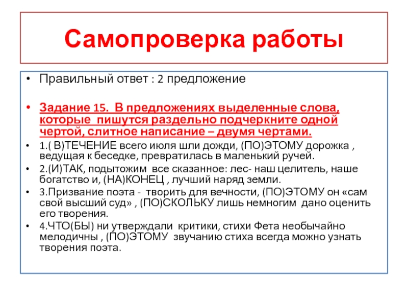 1.( В)ТЕЧЕНИЕ всего июля шли дожди, (ПО)ЭТОМУ дорожка , ведущая к беседке, превратилась в маленький ручей.