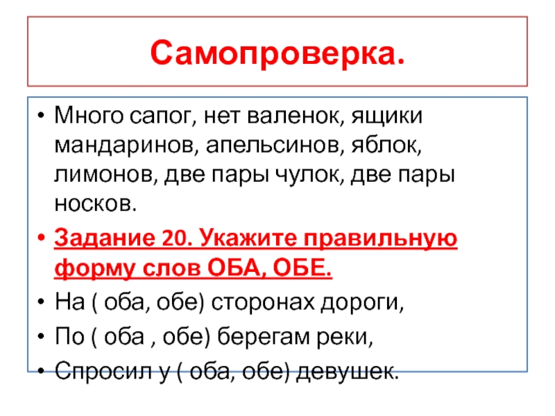 Задание 20. Укажите правильную форму слов ОБА, ОБЕ.