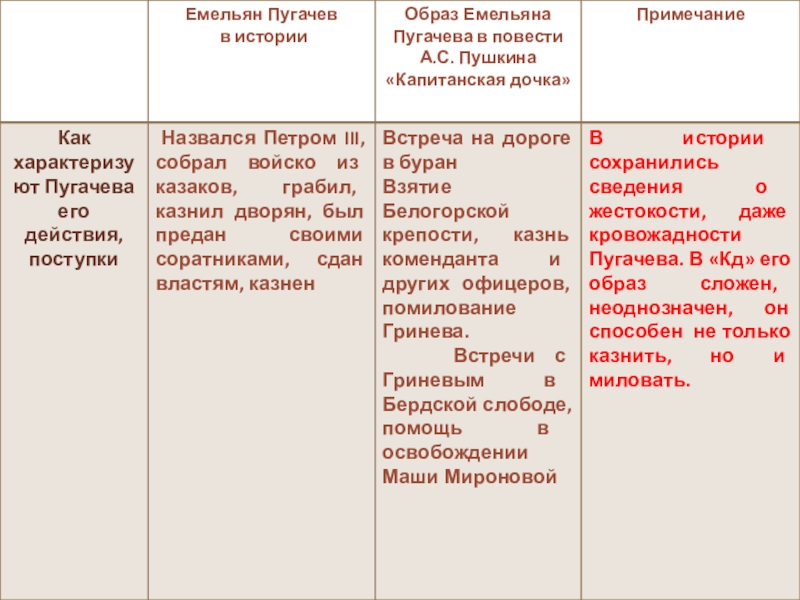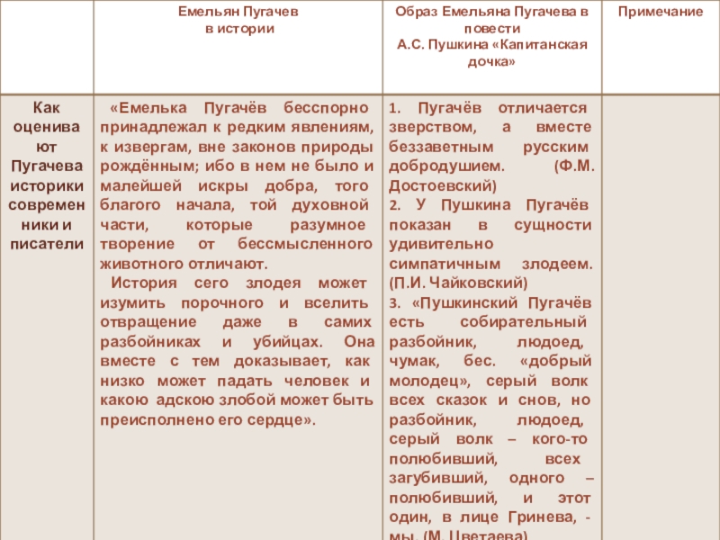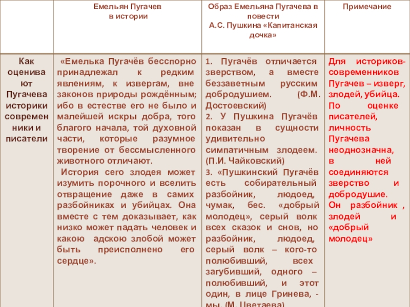 Пётр Гринёв, хотя и называет Пугачёва самозванцем, разбойником, злодеем, но всё-таки тоже симпатизирует ему, не хочет его гибели, приходит проститься в день казни.