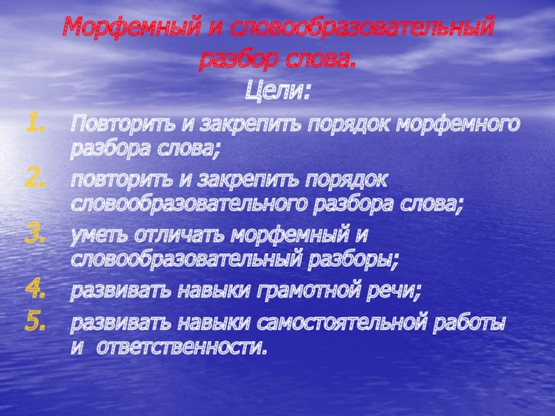 Морфемный и словообразовательныйразбор слова.Цели:Повторить и закрепить порядок морфемного разбора слова;повторить и закрепить порядок словообразовательного разбора слова;уметь отличать морфемный и словообразовательный разборы;развивать навыки грамотной речи;развивать навыки самостоятельной работы и ответственности.