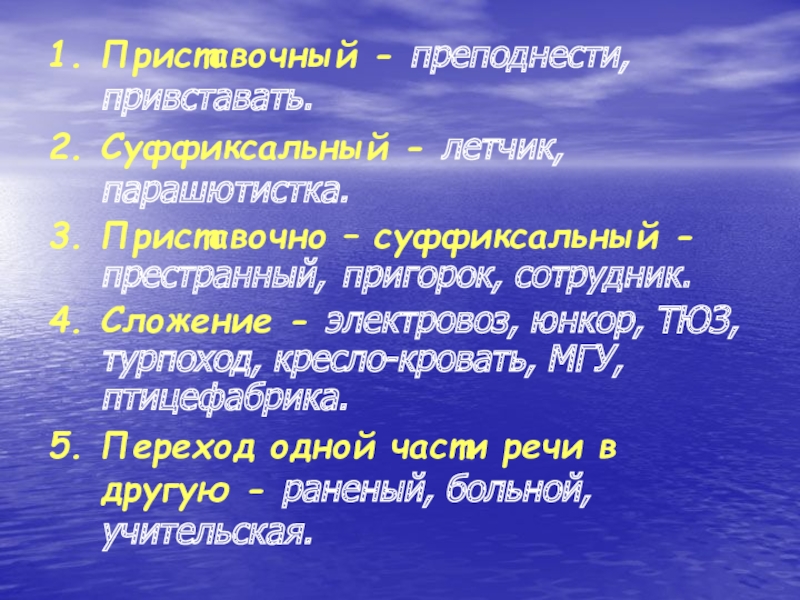 1. Приставочный - преподнести, привставать. 2. Суффиксальный - летчик, парашютистка.3. Приставочно – суффиксальный - престранный, пригорок, сотрудник.4.