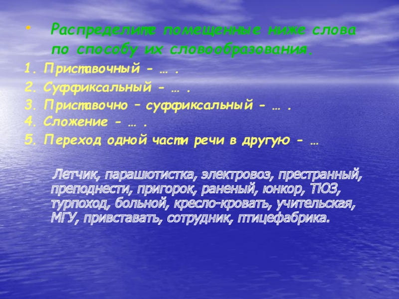 Слайд 9Распределите помещенные ниже слова по способу их словообразования.