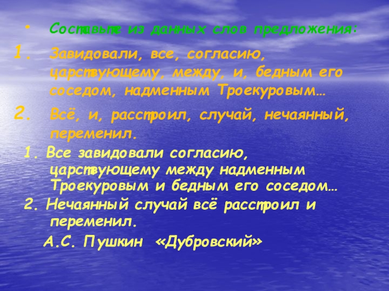 Составьте из данных слов предложения:Завидовали, все, согласию, царствующему, между, и, бедным его соседом, надменным Троекуровым…Всё, и, расстроил,