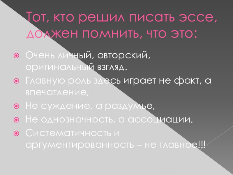дает краткое определение эссе как «прозаического этюда, представляющего общие или предварительные соображения о каком-либо предмете или по какому-либо поводу, нередко случайнгому».