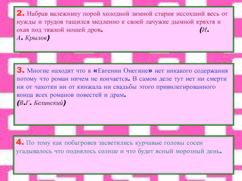 4. По тому как побагровев засветились курчавые головы сосен угадывалось что поднялось солнце и что будет ясный морозный день.