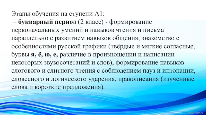 формирование первоначальных умений и навыков чтения и письма параллельно с развитием навыков общения, знакомство с особенностями русской графики (твёрдые и мягкие согласные, буквы я, ё, ю, е, различие в произношении и написании некоторых звукосочетаний и слов), формирование навыков слогового и слитного чтения с соблюдением пауз и интонации, словесного и логического ударения, правописания (изученные слова и короткие предложения).