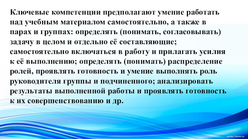 Слайд 5Ключевые компетенции предполагают умение работать над учебным материалом самостоятельно, а также