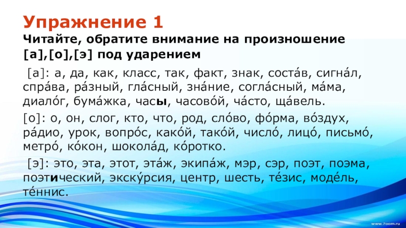 Читайте, обратите внимание на произношение [а],[о],[э] под ударением
