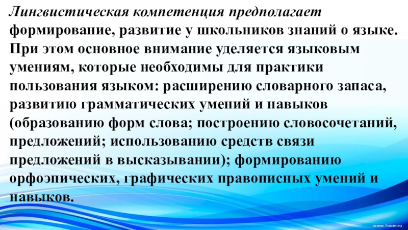 Слайд 7Лингвистическая компетенция предполагает формирование, развитие у школьников знаний о языке. При