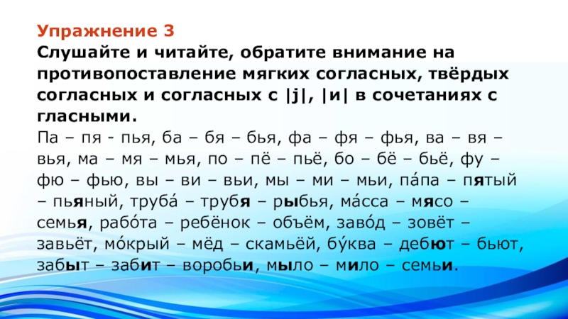 Слушайте и читайте, обратите внимание на противопоставление мягких согласных, твёрдых
