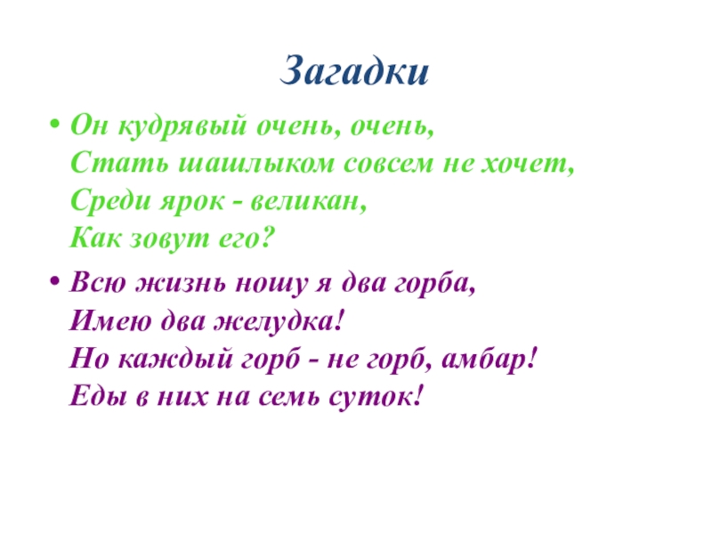 Всю жизнь ношу я два горба, Имею два желудка! Но каждый горб - не горб, амбар! Еды в них на семь суток!
