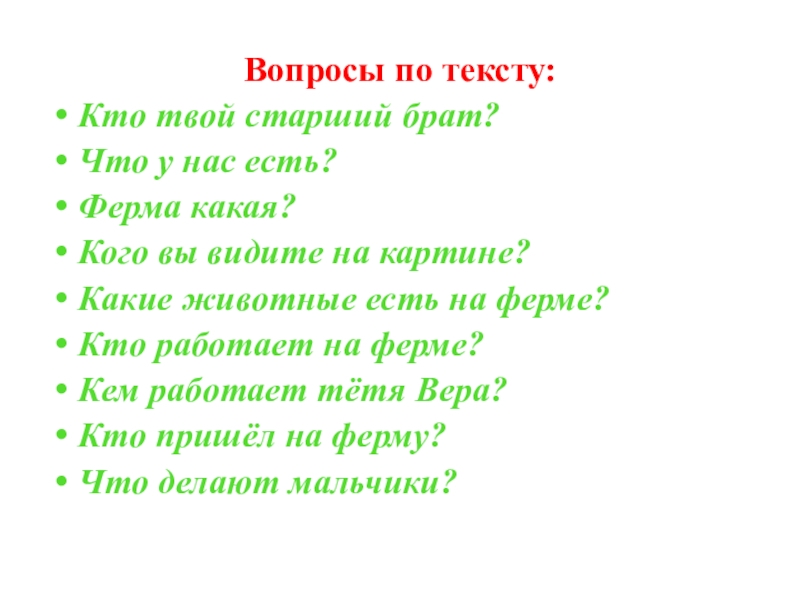 Вопросы по тексту:Кто твой старший брат?Что у нас есть?Ферма какая?Кого вы видите на картине?Какие животные есть на