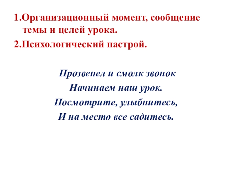 1.Организационный момент, сообщение темы и целей урока.2.Психологический настрой. Прозвенел и смолк звонокНачинаем наш урок.Посмотрите, улыбнитесь,И на место