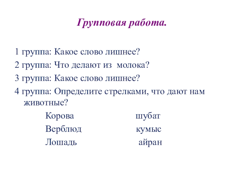 Групповая работа.1 группа: Какое слово лишнее? 2 группа: Что делают из молока?3 группа: Какое слово лишнее? 4