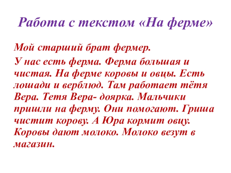 Ферма большая и чистая. На ферме коровы и овцы. Есть лошади и верблюд. Там работает тётя Вера. Тетя Вера- доярка. Мальчики пришли на ферму. Они помогают. Гриша чистит корову. А Юра кормит овцу.Коровы дают молоко. Молоко везут в магазин.