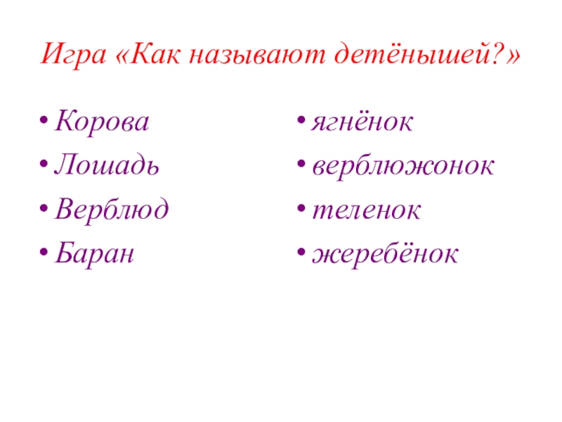 Игра «Как называют детёнышей?»КороваЛошадьВерблюдБаранягнёнокверблюжоноктеленокжеребёнок