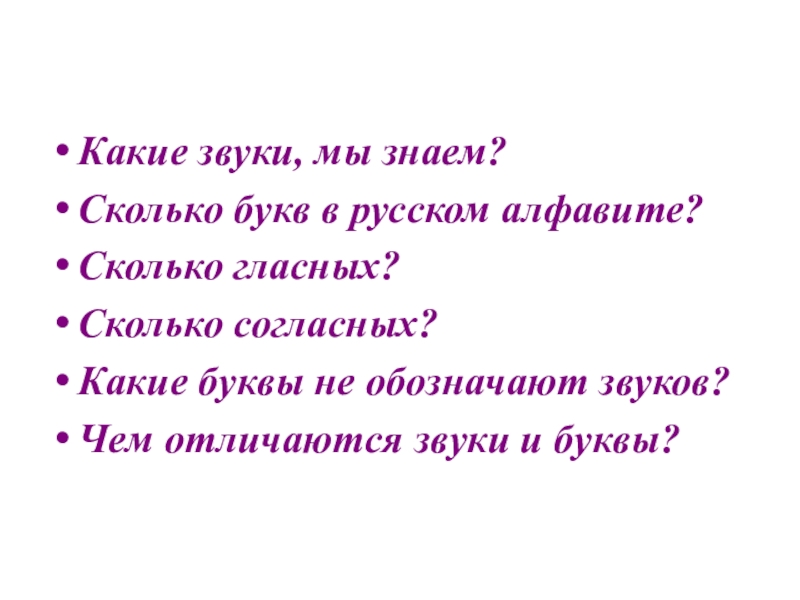 Какие звуки, мы знаем?Сколько букв в русском алфавите?Сколько гласных?Сколько согласных?Какие буквы не обозначают звуков?Чем отличаются звуки и