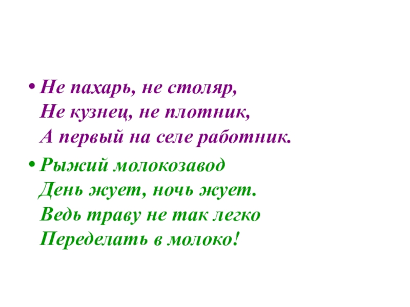 Слайд 6Не пахарь, не столяр, Не кузнец, не плотник, А первый на селе работник.