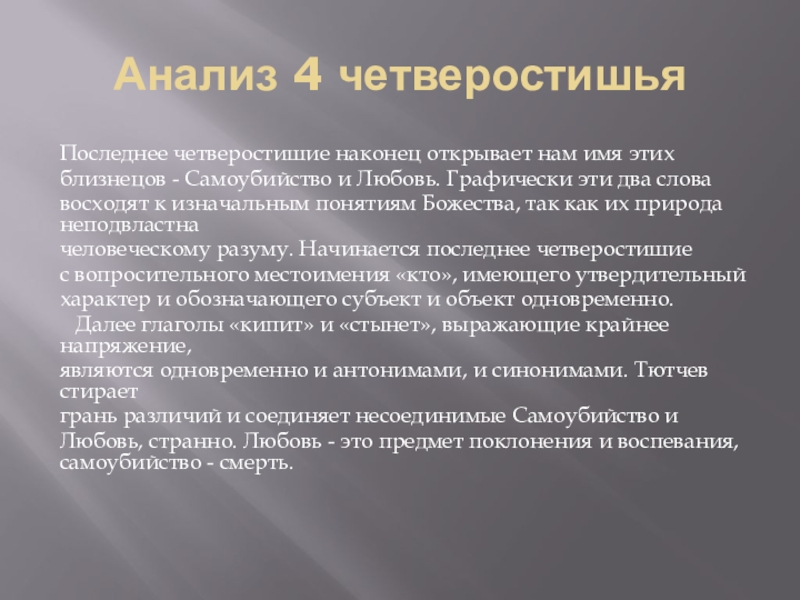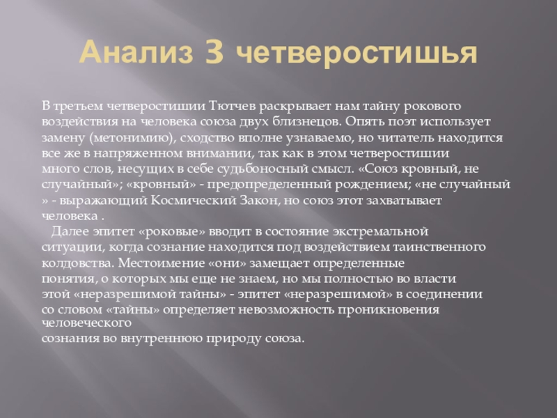 В третьем четверостишии Тютчев раскрывает нам тайну рокового