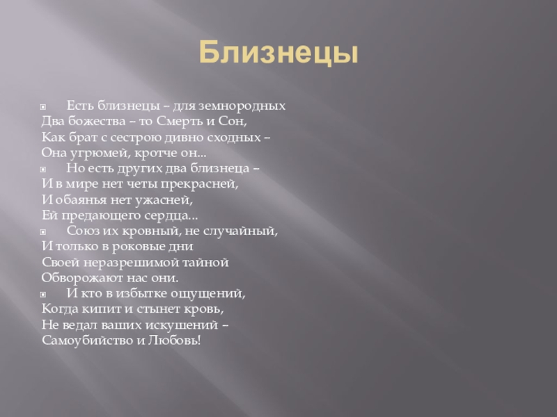 равновесие на противоположностях(жизнь - смерть, любовь - ненависть, смерть - сон) . Ему свойственно