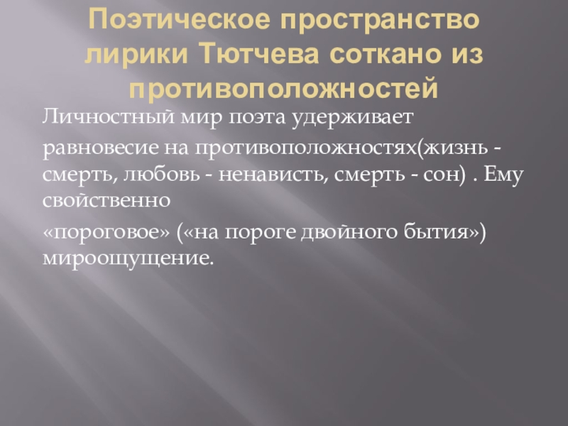 Слайд 3Поэтическое пространство лирики Тютчева соткано из противоположностей