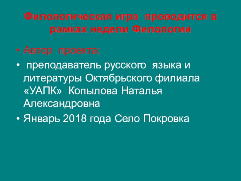 Филологическая игра проводится в рамках недели ФилологииАвтор проекта: преподаватель русского языка и литературы Октябрьского филиала «УАПК» Копылова Наталья АлександровнаЯнварь 2018 года Село Покровка