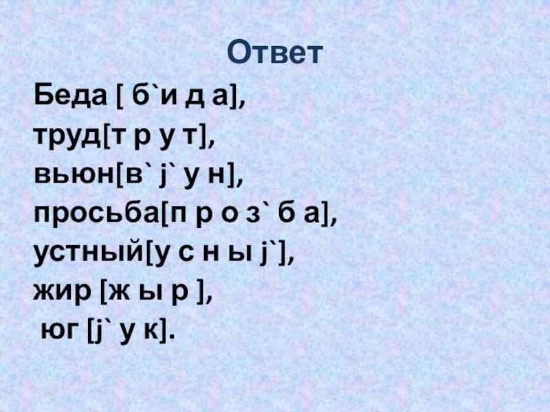 ОтветБеда [ б`и д а],труд[т р у т],вьюн[в` j` у н],просьба[п р о з` б а],устный[у с