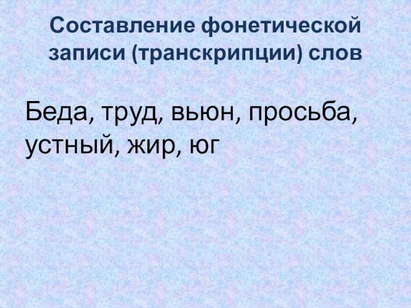Составление фонетической записи (транскрипции) словБеда, труд, вьюн, просьба, устный, жир, юг