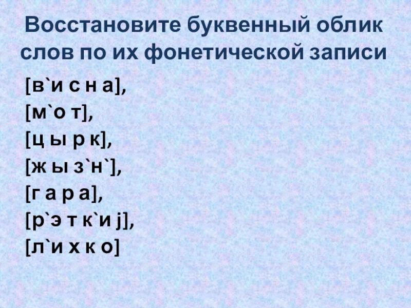 Слайд 5Восстановите буквенный облик слов по их фонетической записи