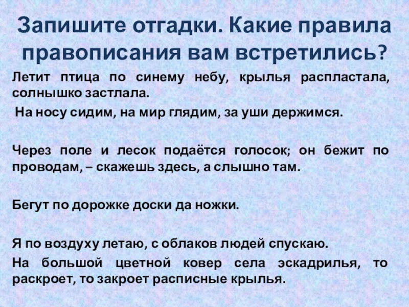 Запишите отгадки. Какие правила правописания вам встретились?Летит птица по синему небу, крылья распластала, солнышко застлала. На носу