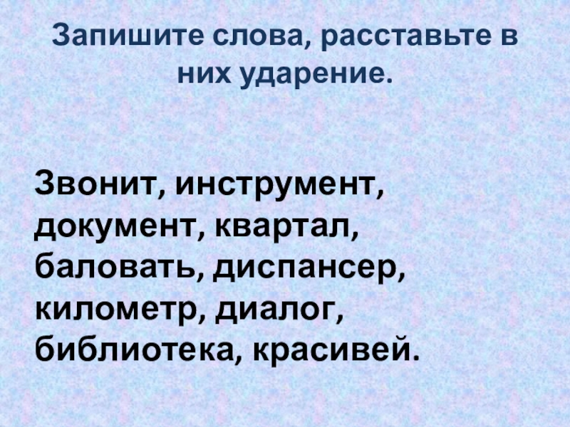Запишите слова, расставьте в них ударение.Звонит, инструмент, документ, квартал, баловать, диспансер, километр, диалог, библиотека, красивей.