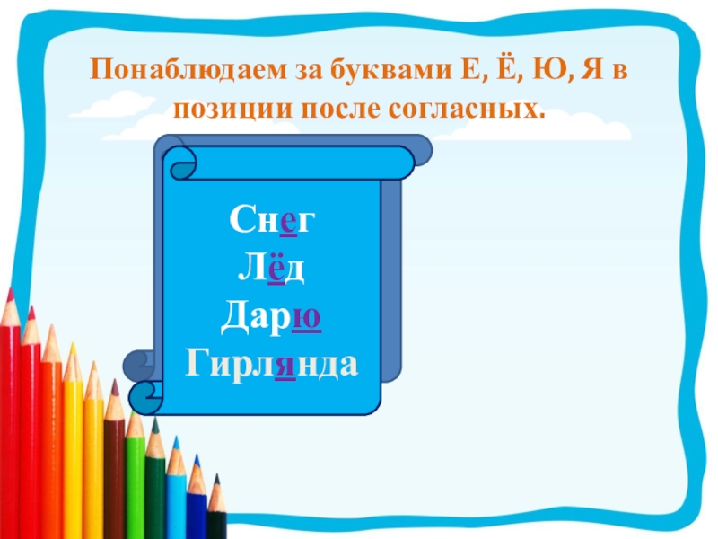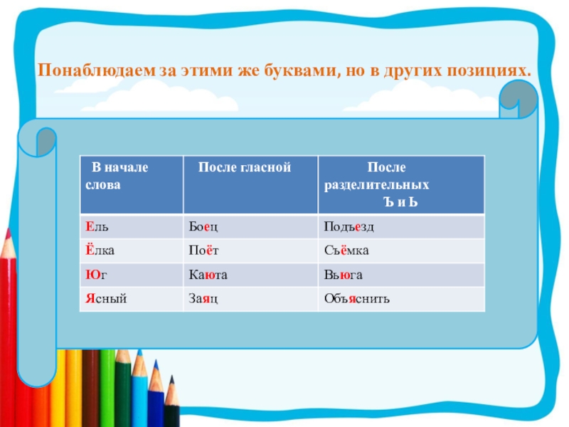 Слайд 4Понаблюдаем за буквами Е, Ё, Ю, Я в позиции после согласных.