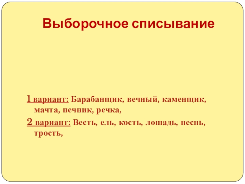 1 вариант: Барабанщик, вечный, каменщик, мачта, печник, речка,