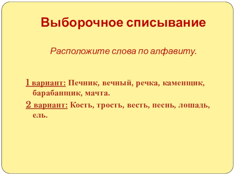 2 вариант: Кость, трость, весть, песнь, лошадь, ель.