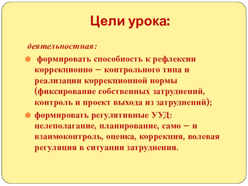 формировать регулятивные УУД: целеполагание, планирование, само – и взаимоконтроль, оценка, коррекция, волевая регуляция в ситуации затруднения.