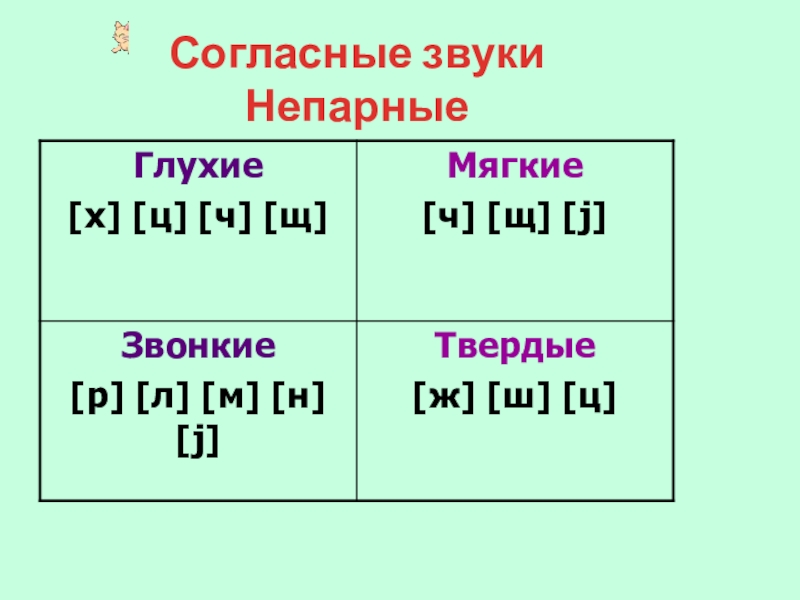 Сонорные, звонкие/глухие, мягкие/твердые звуки