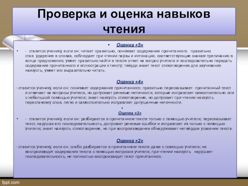 - ставится ученику, если он: слабо разбирается в прочитанном тексте даже с помощью учителя; не воспроизводит содержания текста с помощью вопросов учителя; при чтении наизусть нарушает последовательность, не полностью воспроизводит текст прочитанного.