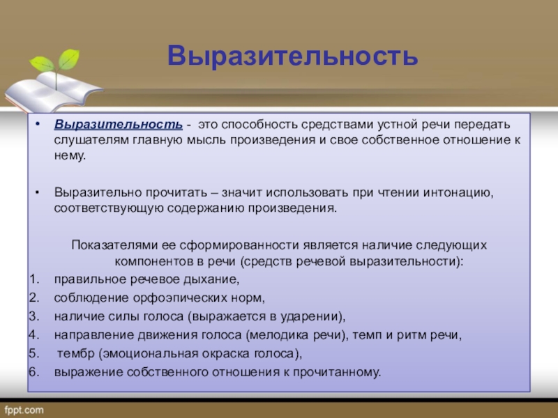 Слайд 5Выразительность - это способность средствами устной речи передать слушателям главную мысль