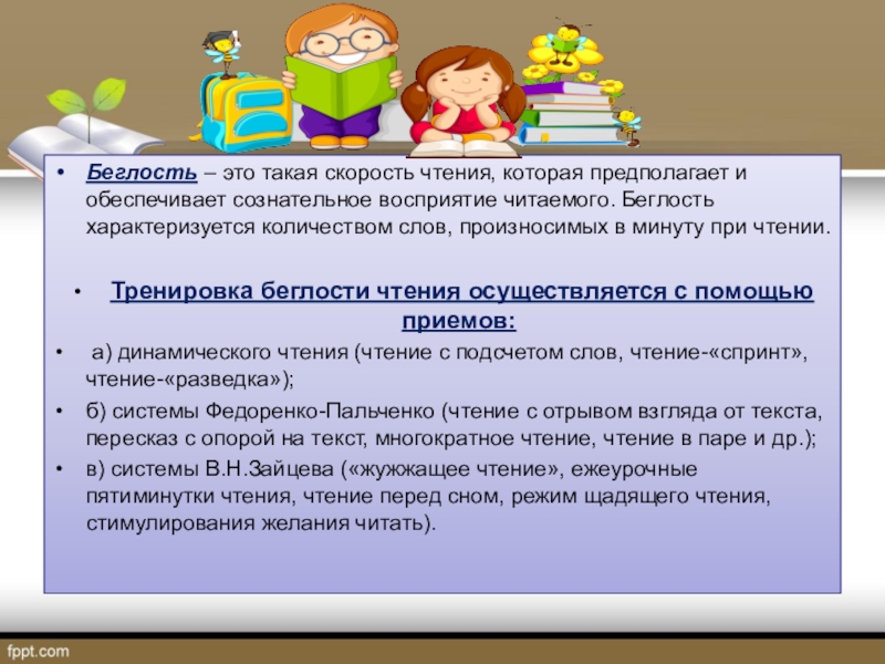 Слайд 9Беглость – это такая скорость чтения, которая предполагает и обеспечивает сознательное восприятие