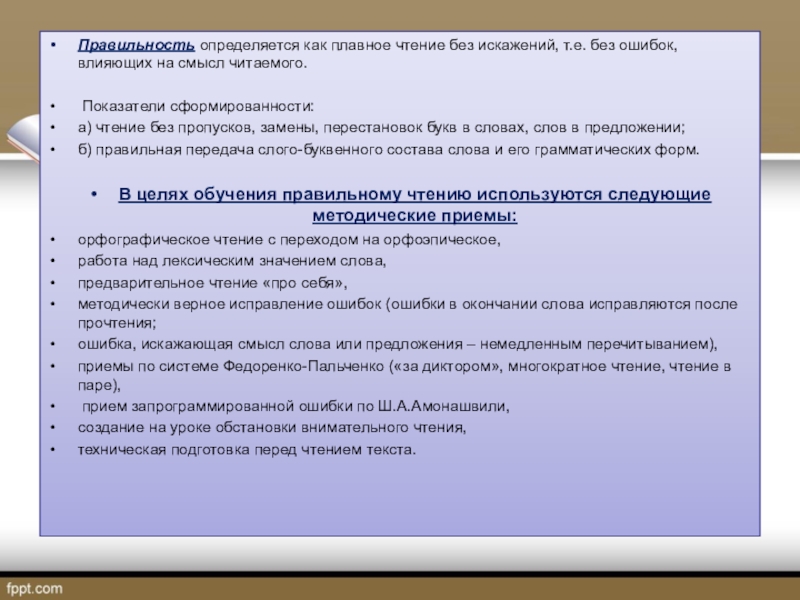Слайд 8Правильность определяется как плавное чтение без искажений, т.е. без ошибок, влияющих на
