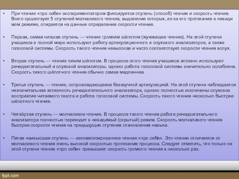 Слайд 15При чтении «про себя» экспериментатором фиксируется ступень (способ) чтения и скорость