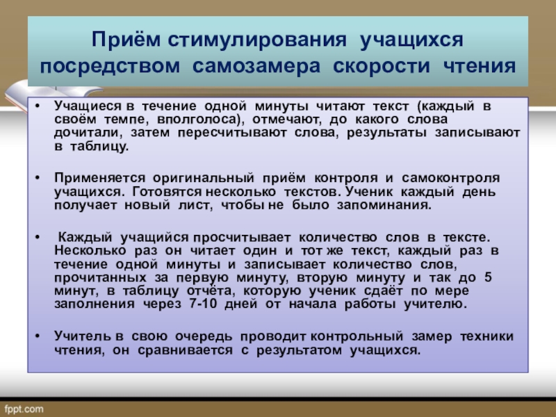 Слайд 11Приём стимулирования учащихся посредством самозамера скорости чтения