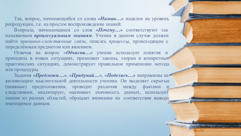 Слайд 23Так, вопрос, начинающийся со слова «Назови…» нацелен на уровень репродукции, т.е.
