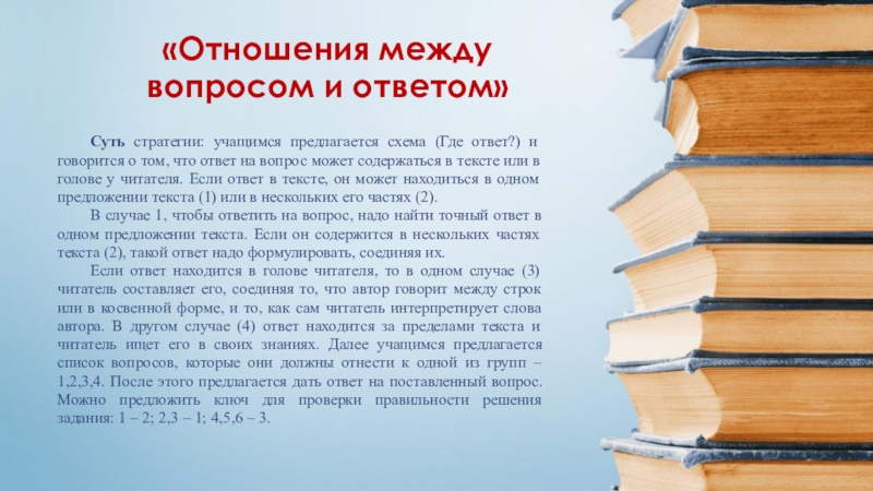 Если ответ находится в голове читателя, то в одном случае (3) читатель составляет его, соединяя то, что автор говорит между строк или в косвенной форме, и то, как сам читатель интерпретирует слова автора. В другом случае (4) ответ находится за пределами текста и читатель ищет его в своих знаниях. Далее учащимся предлагается список вопросов, которые они должны отнести к одной из групп – 1,2,3,4. После этого предлагается дать ответ на поставленный вопрос. Можно предложить ключ для проверки правильности решения задания: 1 – 2; 2,3 – 1; 4,5,6 – 3.