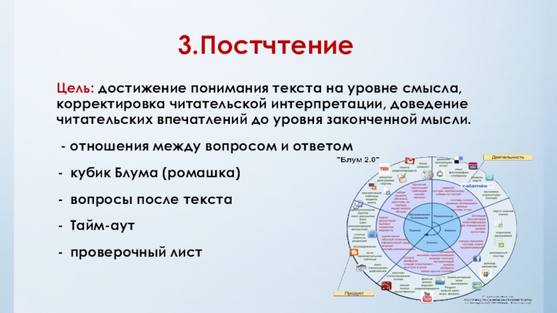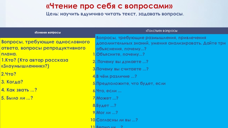 Цель: достижение понимания текста на уровне смысла, корректировка читательской интерпретации, доведение