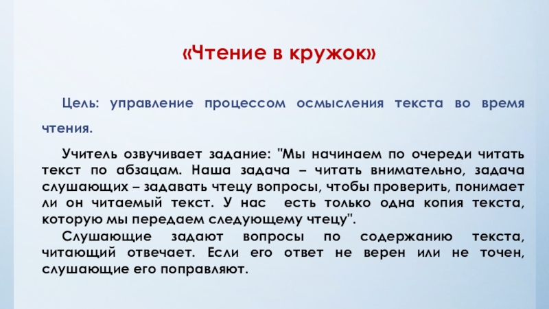 задание: "Мы начинаем по очереди читать текст по абзацам. Наша задача – читать внимательно, задача слушающих – задавать чтецу вопросы, чтобы проверить, понимает ли он читаемый текст. У нас есть только одна копия текста, которую мы передаем следующему чтецу".