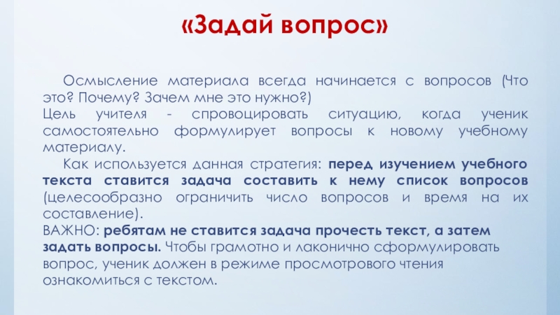 Как используется данная стратегия: перед изучением учебного текста ставится задача составить к нему список вопросов (целесообразно ограничить число вопросов и время на их составление).