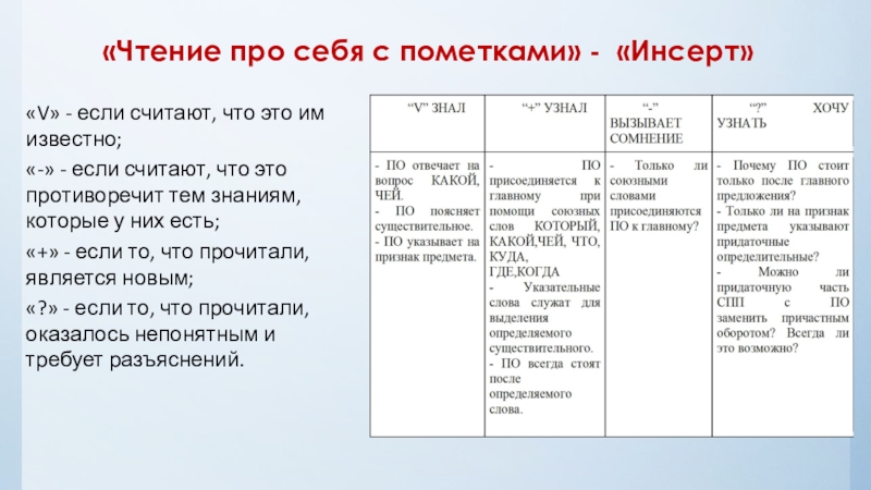 Слайд 17«Чтение про себя с пометками» - «Инсерт»